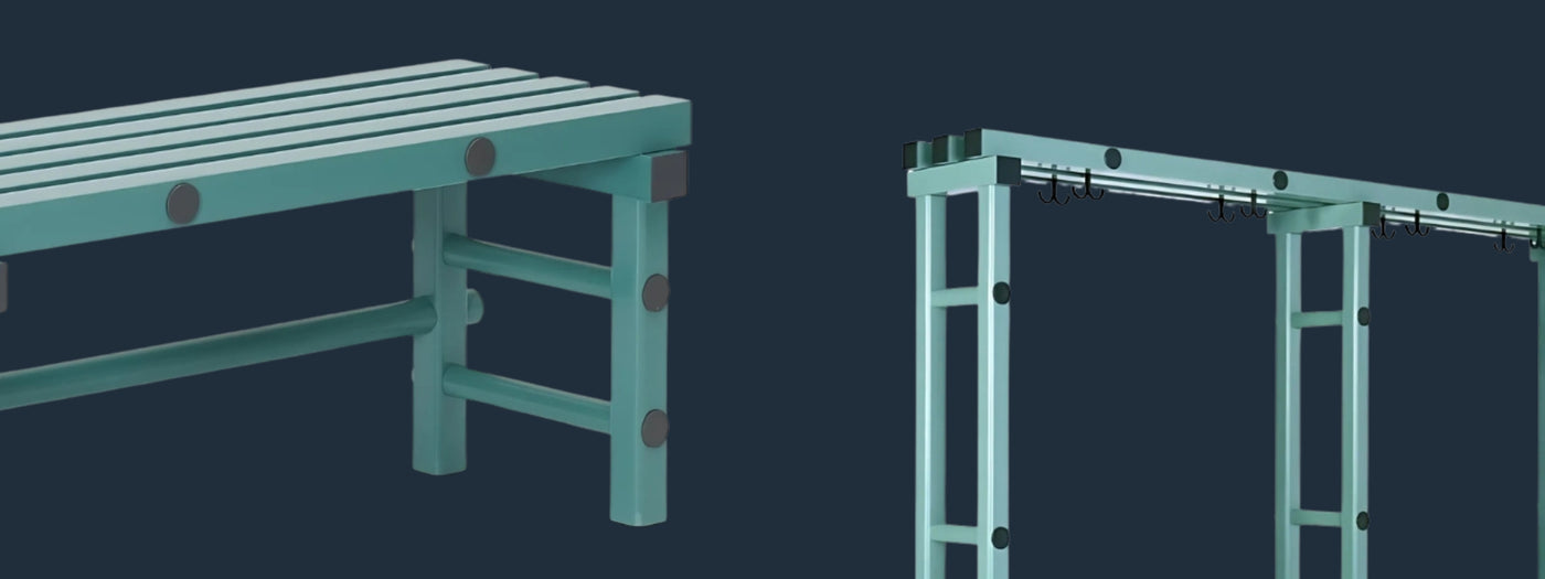 Changing Room Benches made from durable plastic, designed specifically for wet and humid environments like gyms, pools, and locker rooms. These benches offer long-lasting performance and resistance to moisture damage.